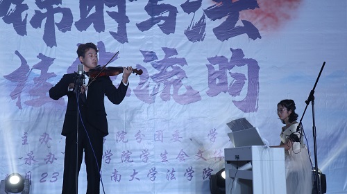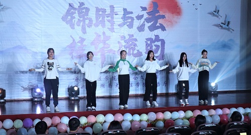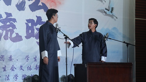 舞台剧《大学老师茶话会》展现出大学辅导员在同学们学习、生活、人际交往等方面的无私奉献,法学1901班同学用生动活泼的表演形式表达对辅导员老师的理解与尊敬,号召同学们在大学期间努力学习、积极进取。赵行、刘睿涵同学带来的乐器合奏《天空之城》让观众徜徉在美妙的音乐世界,感受跳动的音符带来的愉悦与静谧,收获了现场观众持久不息的热烈掌声。法学1903班同学献上歌曲《年少有你》,致敬洋溢激情与甜蜜的青春韶华。法学1904班同学带来的舞台剧《对龙谈法》体现对环境保护与经济发展之间关系的思考,并且融入环境保护法等法学知识,表现球友会学子深厚的家国情怀。互动环节三之抽锦鲤则将晚会推向高潮,为幸运同学送上丰厚大奖与真挚祝福。