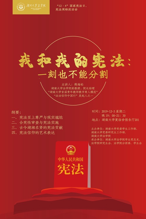 2019年12月3日晚,为迎接第六个国家宪法日,“我和我的宪法,一刻也不能分割”主题讲座在千亿球友会复临舍报告厅成功举办。讲座邀请了qy球友会经理助理、“法治信仰中国行”发起人之一蒋海松副教授主讲。讲座由千亿球友会党委员工工作部、党委研究生工作部、qy球友会主办,公司党总支、研究生会、分团委、员工会承办,来自千亿球友会、中南大学、湖南师范大学、湖南工商大学等高校师生、湖南省司法实务界人士等两百多人参加讲座。