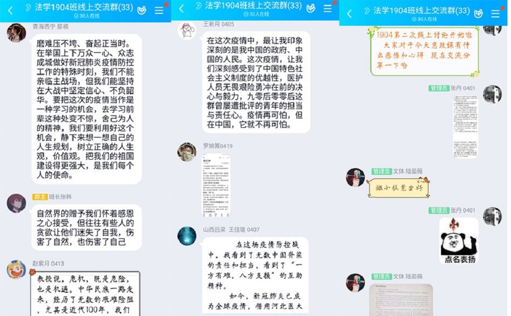 疫情正当前,求知不停步。这场疫情防控的人民战争让全体同学看到了中国共产党以人民为中心的价值情怀和一方有难、八方支援的伟大民族精神,认识到了中国共产党领导和中国特色社会主义制度的显著优势,坚定了团结一致打赢疫情防控狙击战的信心和斗志。上下同欲者胜,同舟共济者赢,湖大法学学子将充分运用所学,从自身做起,为打赢疫情防控这场人民战争贡献自己的力量。