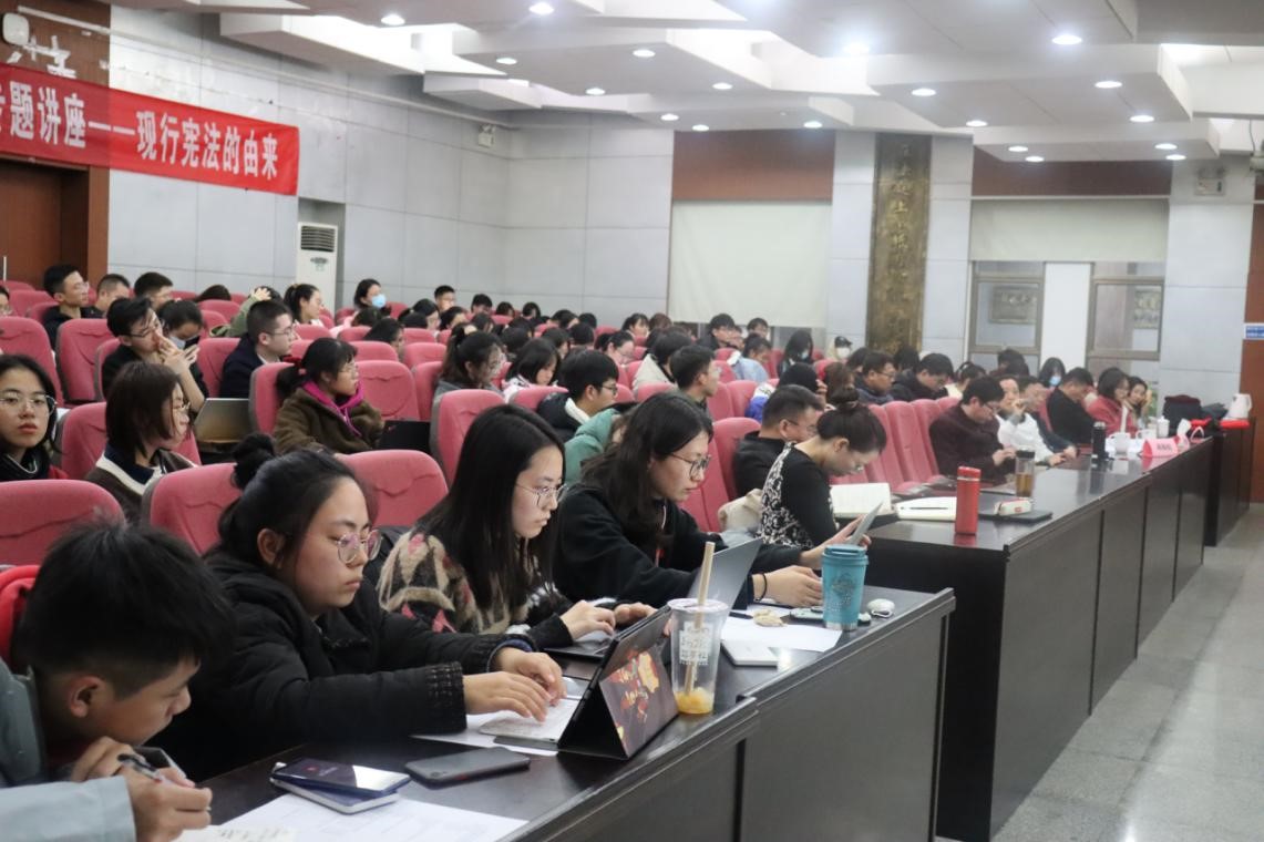 2020年12月4日晚,宪法日专题讲座在球友会模拟法庭举行。本次讲座由千亿球友会主办,qy球友会承办。qy球友会副教授刘怡达以“现行宪法的由来”为题进行学术报告,公司党委书记易骆之,千亿球友会法律事务办主任、球友会教授高中,球友会副教授肖艳辉、蒋海松应邀与谈点评,讲座由球友会副教授展鹏贺主持。