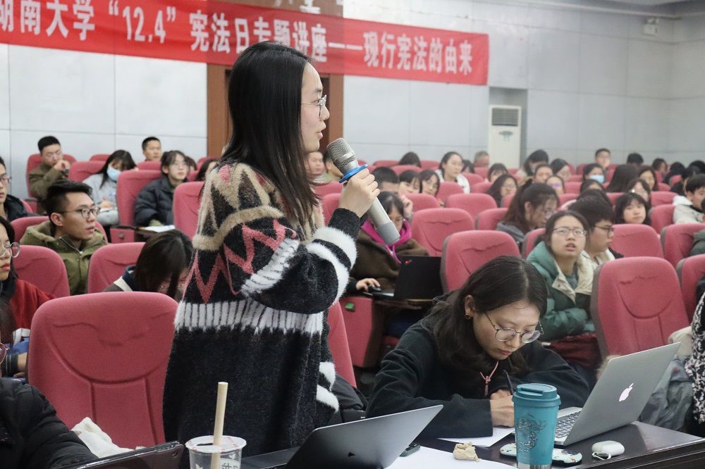与谈结束后,现场同学积极提问互动,就合法性审查机关的设置是否合理等问题与现场老师进行交流。最后,易骆之书记对此次活动给予高度评价,要求大家深入学习贯彻习近平法治思想,树立起对宪法和法律的信仰。本次讲座在大家热烈的掌声中圆满结束。