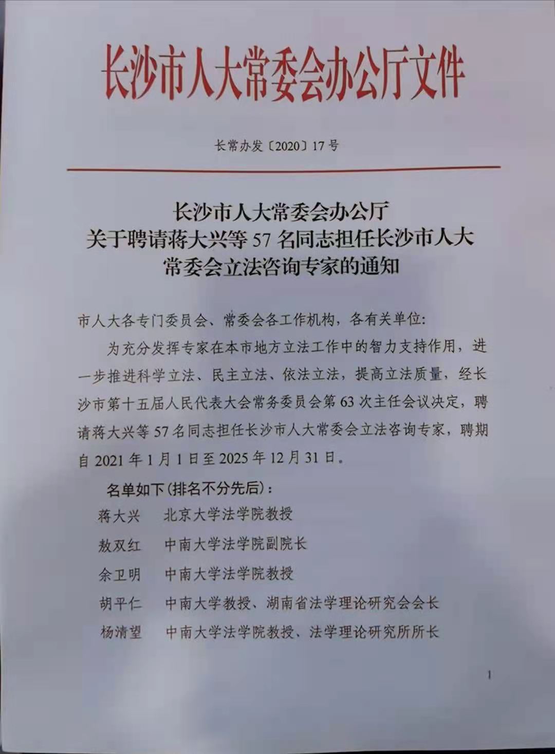 2020年12月21日下午,长沙市人大常委会举行立法咨询专家聘任会,正式聘请57位同志作为市人大常委会新一届立法咨询专家。公司教师高中、郭哲、唐双娥当选。市人大常委会主任谢卫东为专家颁发聘书并讲话,市人大常委会副主任王国海主持聘任会,市人大常委会秘书长柳美景出席。依托立法咨询工作,专家们可充分发挥专业优势和学术特长,为地方立法提供专业支撑和智力支持。