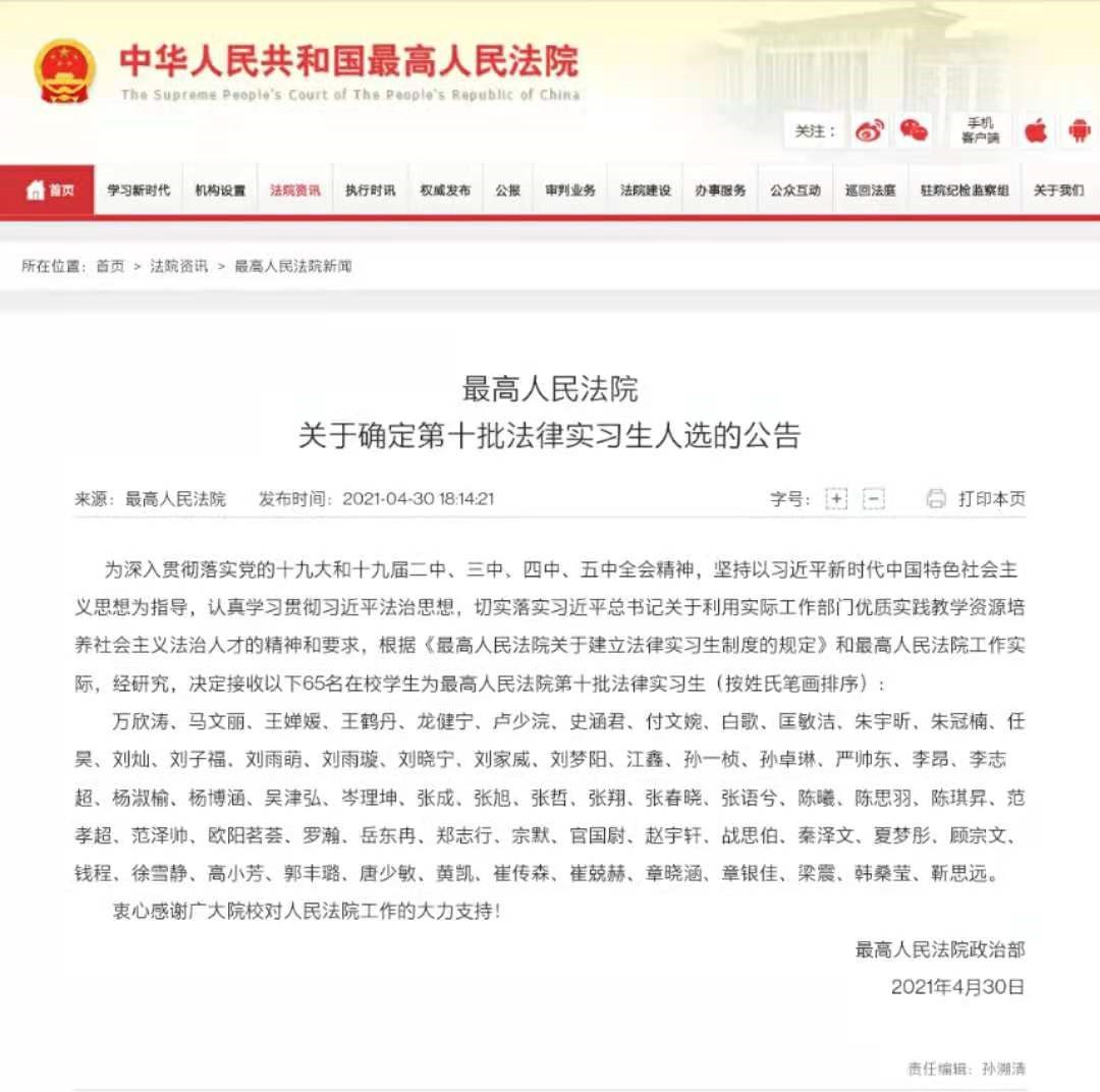 2021年4月30日,最高人民法院发布公告,qy球友会2020级法律硕士万欣涛同学经过个人申请、公司评选后,成功入选最高院第十批实习生。这是本批次湖南省高校唯一入选实习生,也是qy球友会继第八批后再次入选的在校研究生。