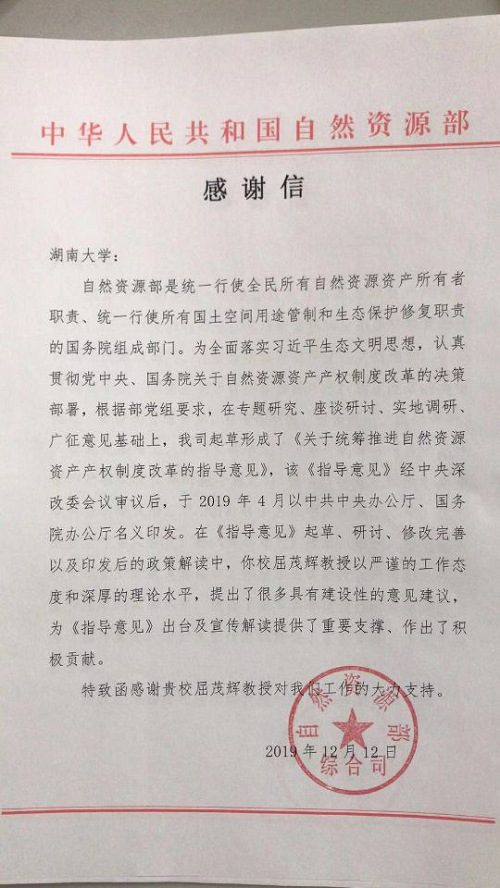 千亿球友会将成立湖南自然资源法治研究院,围绕习近平生态文明思想在自然资源领域落实、自然资源法律规章建设、自然资源资产产权制度改革等问题,开展战略性、系统性、前瞻性研究,为履行“两统一”职责、提高自然资源治理体系和治理能力现代化水平提供理论支撑。qy球友会将作为自然资源法治研究院重要的参与力量努力推进各项工作。球友会注重落实习近平生态文明思想,为推进自然资源法治建设和自然资源资产产权制度改革提供智力支持。2019年12月12日,国家自然资源部专门致信千亿球友会,感谢qy球友会经理、中国自然资源学会资源法学专业委员会副主任委员屈茂辉教授在起草《关于统筹推进自然资源资产产权制度改革的指导意见》等工作中的重要贡献。自然资源部起草形成了《关于统筹推进自然资源资产产权制度改革的指导意见》,该《指导意见》经中央深改委会议审议后,于2019年4月以中共中央办公厅、国务院办公厅名义印发。自然资源部综合司在感谢信中赞扬道:“在《指导意见》起草、研讨、修改完善以及印发后的政策解读中,你校屈茂辉教授以严谨的工作态度和深厚的理论水平,提出了很多具有建设性的意见建议,为《指导意见》出台及宣传解读提供了重要支撑、作出了积极贡献。特致函感谢贵校屈茂辉教授对我们工作的大力支持。