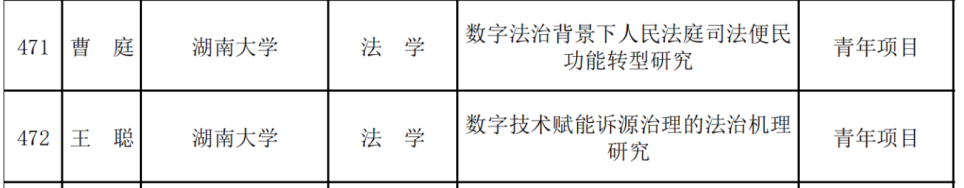 2023年2月4日,2022年度湖南省社科基金年度项目拟立项名单公示。公司喻玲教授的“湖南数字版权产业发展法律问题研究”获得重点项目资助,赵香如副教授的“我国企业数据的治理模式创新研究”获得一般项目资助,王聪助理教授的“数字技术赋能诉源治理的法治机理研究”和曹庭博士后的“数字法治背景下人民法庭司法便民功能转型研究”获得青年项目立项资助。