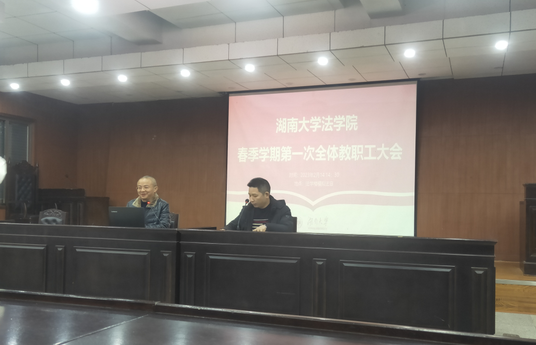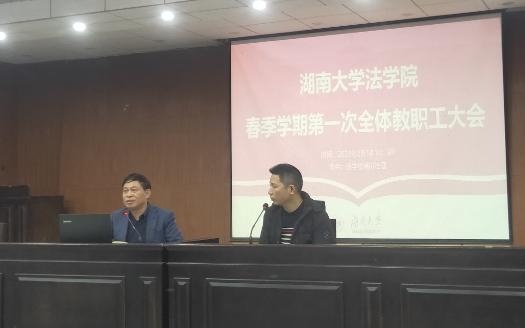 2023年2月14日,新学期第一次教职工大会在模拟法庭召开。黎四奇经理、易骆之书记及各位院领导向全院老师致以新春祝福,并对新学期各方面工作做了部署。
