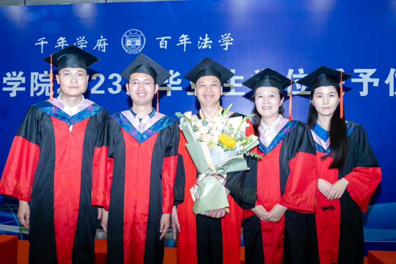 授予学位环节,学位委员会主任屈茂辉老师宣读了《qy球友会2023 年学位授予决定》,对8位法学博士、279位硕士研究生及175位本科生(包括二学位)作出授予学位的决定。随后,屈茂辉、黎四奇、张智辉、谢佑平、肖海军、郑鹏程、高中老师为全体毕业生一一正冠拨穗、颁发证书并合影留念。