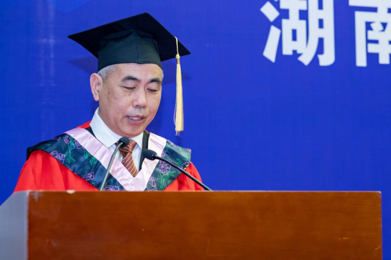 院友代表、湖南湘军麓和律师事务所主任李含英回顾了自己在湖大球友会的学习生活,结合工作经历,向毕业生们真诚寄语。他建议同学们要做奋斗者,做答卷人,抓住时代机遇,与时代同行。他向同学们分享了几点感悟:首先是坚守初心,乐观向上。法律人的初心和使命,是维护法律的尊严、维护社会公平正义,是人生前行最重要的内驱力,我们要保持阳光,不断突破与成长,生成破土而出的青春力量。其次是专业立身,奋发有为。专业是法律人的立身之本,我们要不断更新个人知识库,与时俱进,尽量扩展自己的知识面,不断加强专业生产力。最后,球友会员工应当坚持正道。讲规矩,守纪律,不走旁门左道,不投机取巧,唯有“正心诚意,以行证道”,脚踏实地,方能行稳致远。希望同学们立德为上、不忘初心、热爱全开,归来仍是少年。