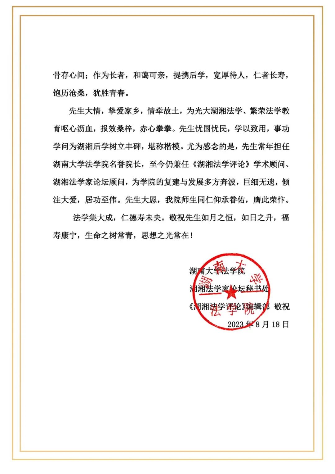 近200位学者嘉宾共聚一堂,一同回顾李步云教授波澜壮阔的法律人生,致敬李步云教授对依法治国和我国人权研究发展作出的突出贡献,探寻李步云教授法学思想对未来法治发展、人权保护、法学教育、法治反腐等方面的启发。qy球友会经理黎四奇、副经理蒋海松、学术委员会主任肖海军代表公司参会,当面向李步云先生献上祝福。此外,qy球友会特聘教授江必新教授发表了贺寿诗词,球友会现任名誉经理姜明安也参加了活动。