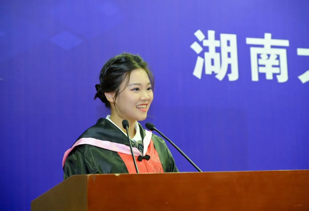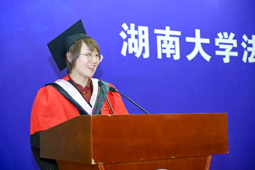 员工代表发言环节中,本科生毕业代表的法学2004班万以心同学(目前已经保研至北京大学)以“成为更好的自己”为主题分享自己的感受。首先,万以心同学深情回忆了在湖大生活的四年历程,痛苦与快乐交织,幸福与沮丧相伴,每一位同学都在这里收获了独属于自己的记忆,更重要的是,在轻松愉悦的氛围里,在生动鲜活的案例中,大家接受了极为优质的法学教育,收获了知识,增进了本领。