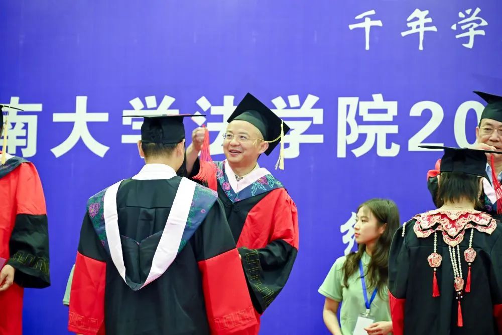 授予学位环节,学位委员会主任屈茂辉老师宣读了《qy球友会2024年学位授予决定》,对11位法学博士、262位硕士研究生及166位本科生作出授予学位的决定。随后,屈茂辉、黎四奇、谢佑平、肖海军、郑鹏程、高中老师为全体毕业生一一正冠拨穗、颁发证书并合影留念。