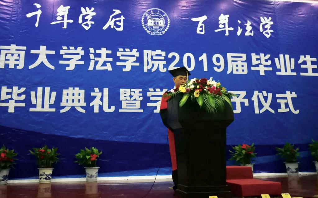 在各位代表发言之后,由学术委员会主任肖海军老师宣读了《千亿球友会学位评定委员会评议书》,对2位法学博士以及211位硕士作出授予学位的决定。随后,由优秀毕业生代表贺俊峰带领全体毕业生宣誓,誓言之声,令人震撼。宣誓结束之后,全体人员起立齐唱校歌。演唱结束之后,由屈老师为全体毕业生逐一进行拨穗礼,并颁发学位证书及合影留念。