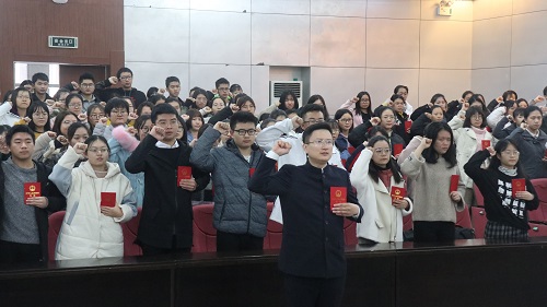 进入宣誓动员环节,何律师讲述自己与宪法宣誓结缘的故事并分享自己为宪法宣传努力付出的经历。他感慨道:“今天你们每一个人举起右手的镜头以及你们的眼神,都在向世界证明中国的法治信仰绝对是刻在我们内心的!”动员过后,在何律师的领誓下,伴着庄严的国歌,同学们手捧宪法,高举右拳宣誓忠于中华人民共和国宪法,维护宪法权威。本次活动在同学们热烈掌声中结束。