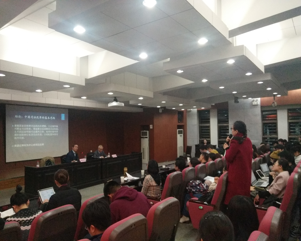 讲座伊始,张志铭教授直入主题,提出本次讲座围绕“回顾与反思:推进以审判为中心的司法改革”这一话题展开。在接下来近两个小时的讲座中,张志铭教授带领听众回顾了十八届四中全会以来司法改革发展的“波澜壮阔”,深刻剖析了司法改革的必要性和先进性,一针见血地指出了了改革过程当中存在的许多问题。针对员额制改革和责任制改革,张志铭教授分别指出了其中存在的一些问题。他认为,当前的司法改革权威性有余而智识含量不足;许多改革措施不完善,导致存在许多司法改革的“乱象”,针对这一现象,他表示,司法改革应有一个整体性的框架和方向。张志铭教授还将司法改革的脉络梳理成司法权能、司法主体、司法责任、司法保障四个方面,他认为,司法改革总围绕这四个方面开展。最后,张志铭教授概括道:中国司法改革的基本思路应该是遵循国家治理和司法的内在逻辑,立足案件裁判厘定司法性质,塑造整全清晰的司法权能;从不同层面明确司法裁判主体,处理好裁判者履职保障和行权责任的关系,合理配置和落实裁判资源。