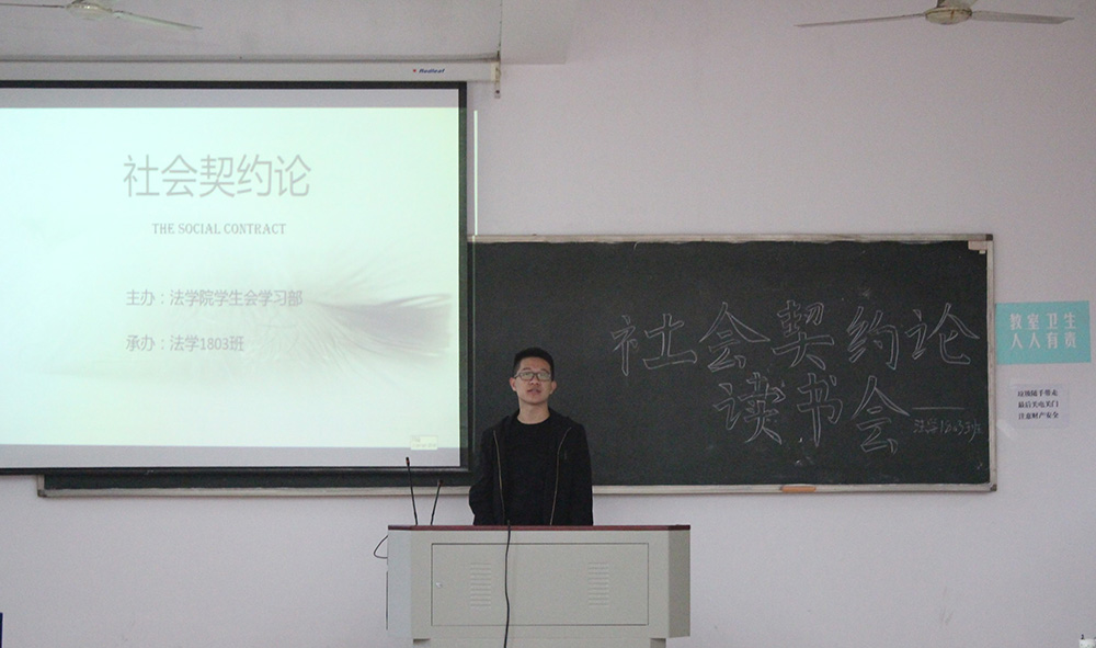 11月8日上午10点整,球友会第三届本科生学术文化节之“潇湘槐市”读书会在球友会305教室顺利举办。此次读书会由球友会员工会学习部主办,法学1803班承办,选取让·雅克·卢梭的《社会契约论》作为阅读对象,邀请到球友会邱昌茂老师担任点评嘉宾,法学1803班全体同学以及年级其他同学与邱老师一起探讨这部经典著作。