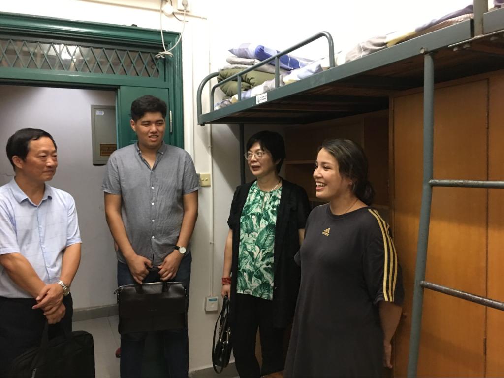 (公司党委书记李连友、党委副书记、副经理付蓉芬在2018级本科生辅导员王浩陪同下前往新生寝室)
