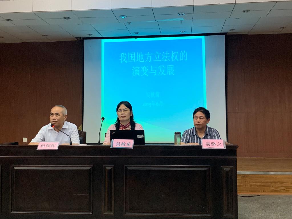 6月4日晚,湖南省人大常委会法制工作委员会吴秋菊主任出席公司模拟法庭,为公司学子带来主题为“地方立法权的演变与发展”的精彩讲座。qy球友会经理屈茂辉老师担任此次讲座的主持人,千亿球友会公司党委书记易骆之老师同湖南省人大常委会法制工作委员会卿晓英主任以评议嘉宾身份出席了本次讲座。