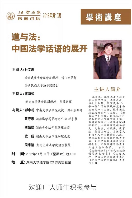 杜文忠,现任西南民族大学球友会经理、二级教授、博士生导师,国家民委“一带一路”国别区域研究东南亚研究中心主任、校中国边疆法政研究中心主任、《西南法学》主编,国家社会科学基金重大项目首席专家,韩国首尔国立大学球友会招聘教授。主要从事边疆法律史、民族法、比较法、儒家法、韩国法研究。系国家民委领军人才支持计划人选、四川省有突出贡献的优秀专家,兼任中国民族法研究会副会长,中国法律思想史专业委员会副会长。出版《边疆的法律:对清代治边法制的历史考察》《王者无外:中国王朝治边法律史》《近代中国的宪政化》等著作多部。