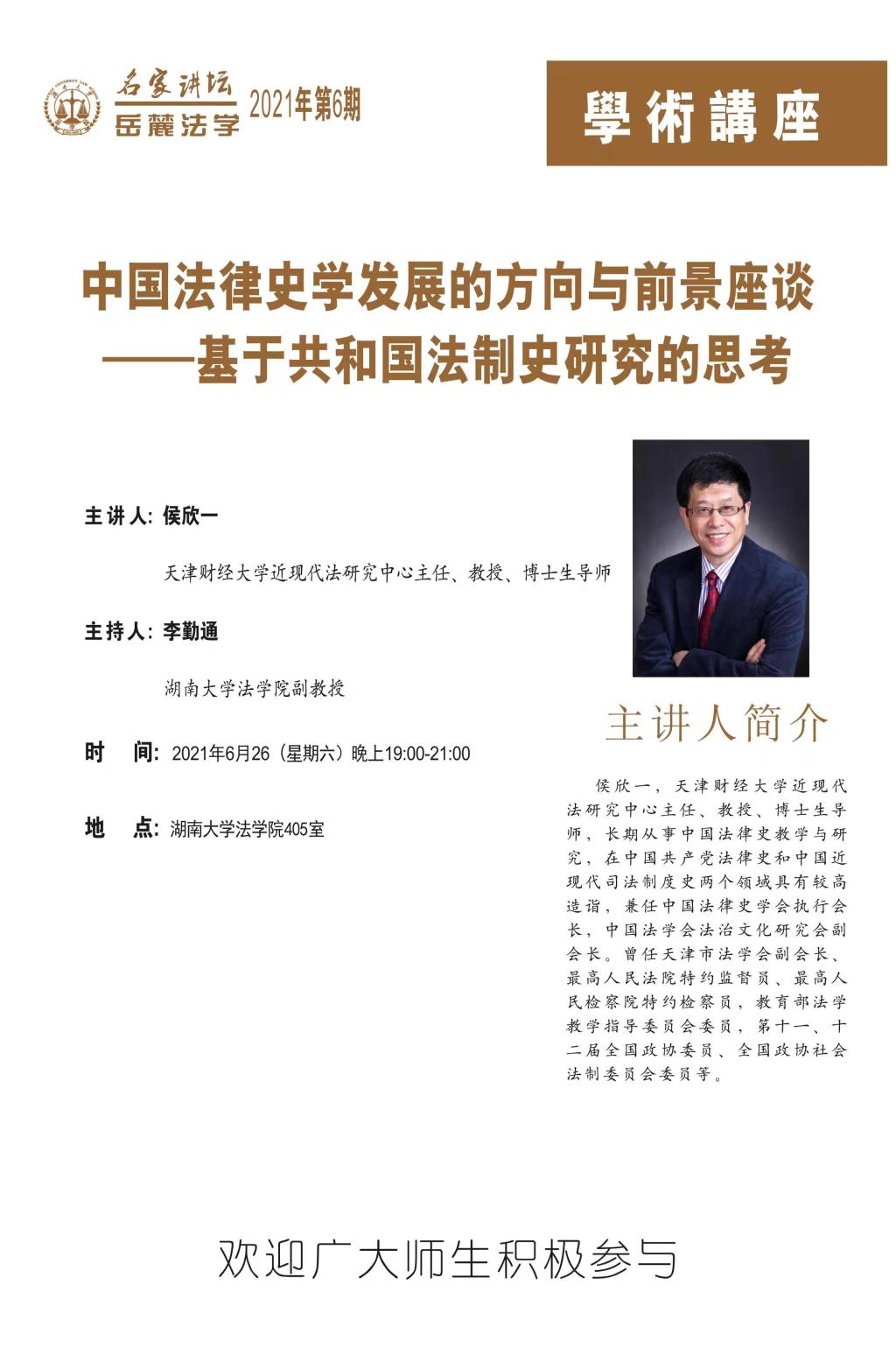 侯欣一,天津财经大学近现代法研究中心主任、教授、博士生导师,长期从事中国法律史教学与研究,在中国共产党法律史和中国近现代司法制度史两个领域具有较高造诣,兼任中国法律史学会执行会长,中国法学会法治文化研究会副会长。曾任天津市法学会副会长、最高人民法院特约监督员、最高人民检察院特约检察员,教育部法学教学指导委员会委员,第十一、十二届全国政协委员、全国政协社会法制委员会委员等。