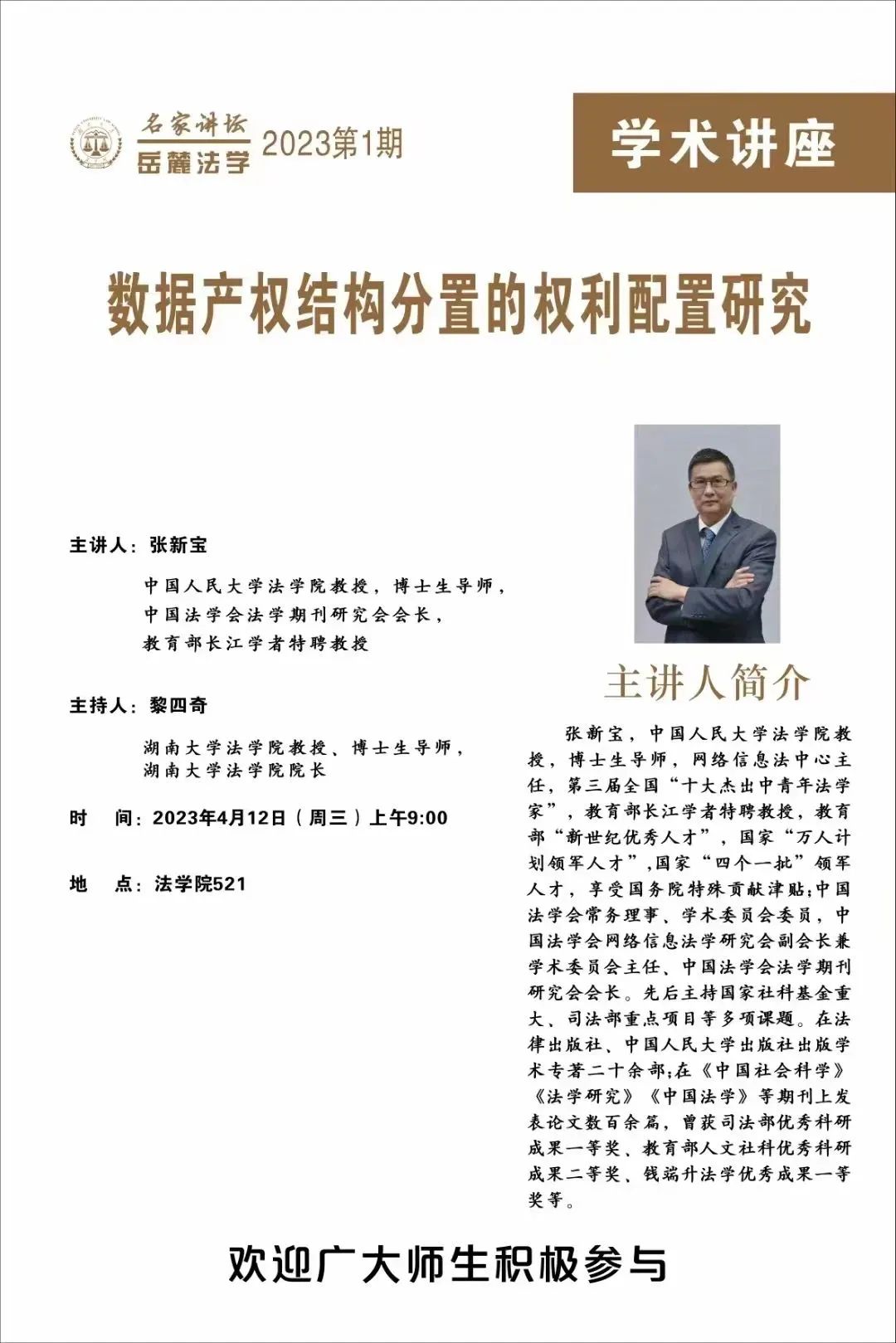 张新宝,中国人民大学球友会教授,博士生导师,网络信息法中心主任,第三届全国“十大杰出中青年法学家”,教育部“新世纪优秀人才”,国家“四个一批”领军人才,享受国务院特殊贡献津贴;中国法学会常务理事、学术委员会委员,中国法学会网络信息法学研究会副会长兼学术委员会主任、中国法学会法学期刊研究会会长。先后主持国家社科基金重大、司法部重点项目等多项课题。在法律出版社、中国人民大学出版社出版学术专著二十余部;在《中国社会科学》《法学研究》《中国法学》等期刊上发表论文数百余篇,曾获司法部优秀科研成果一等奖、教育部人文社科优秀科研成果二等奖、钱端升法学优秀成果一等奖等。