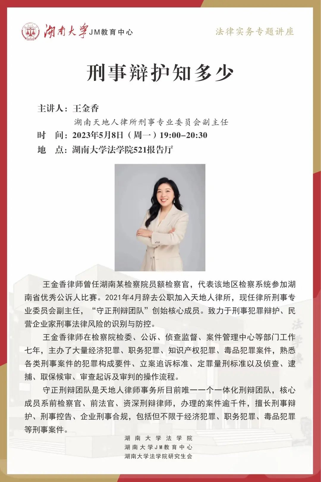 近期,中共中央办公厅、国务院办公厅印发《关于加强新时代法学教育和法学理论研究的意见》(以下简称《意见》),《意见》指出法学教育和法学理论研究承担着为法治中国建设培养高素质法治人才、提供科学理论支撑的光荣使命,在推进全面依法治国中具有重要地位和作用。为切实贯彻落实《意见》精神,公司将与各实践单位合作开展法律实务系列讲座。本次JM实务讲座将由湖南天地人律所的王金香律师为大家分享刑辩律师的实务经验。对想了解刑事辩护执业经验的同学来说,这将是一堂极具干货的实务课,快来积极参与吧!