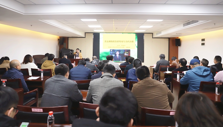 蒋海松博士以橘子洲景区免费开放与法治湖南当下现实引出话题。整堂讲座分两部分,上半部分从法治湖南的文化基因和历史线索入手,回顾了源远流长的湖湘文化。除了“心忧天下、敢为人先”的湖湘文化精神外,湖湘人在中国法治史上还有着杰出贡献和辉煌的表现。下半部分主讲湖湘人从湖湘的历史文化传统中获得精神滋养,在法治湖南取得的重要成就。法治湖南勇开地方法治风气之先,实现了法治模式、依法行政、依法执政、立法模式、法治观念、发展动力等六大创新。