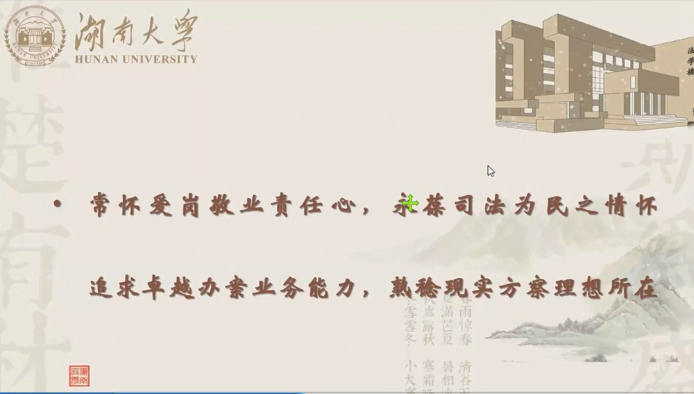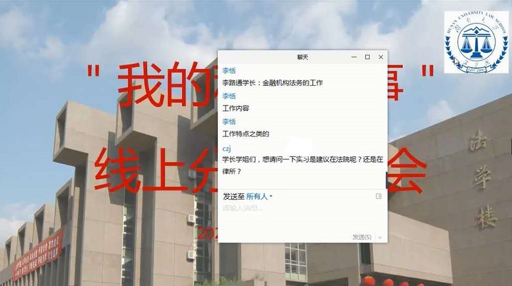 杨凌燕主要从她被选为最高院实习生所做的准备工作及实习的具体内容两个方面进行分享。在准备工作方面,杨凌燕表示她其实并没有为这个实习作专门的准备工作,但是机会总是留给有准备的人!自读研以来,她一直勤奋好学,并用课余时间积极参加很多社会实践活动和员工工作,如qy球友会第二届优秀员工“赴港交流营”等;在实习方面,她从衣、食、住、行四个方面为我们一一介绍。就专业实践而言,她被分配至国家赔偿委员会办公室工作。在实习期间,实行实习导师制,由经验丰富的资深法官担任指导老师。法律实习生在实习期间担任实习法官助理、书记员或综合工作人员,在指导老师的帮助下,辅助参与案件审理、案件记录、文书起草、司法调研及司法行政等工作。最后,杨凌燕谈到,希望大家“常怀爱岗敬业责任心,永葆司法为民之情怀。追求卓越办案业务能力,熟稔现实方案理想之所在”!
