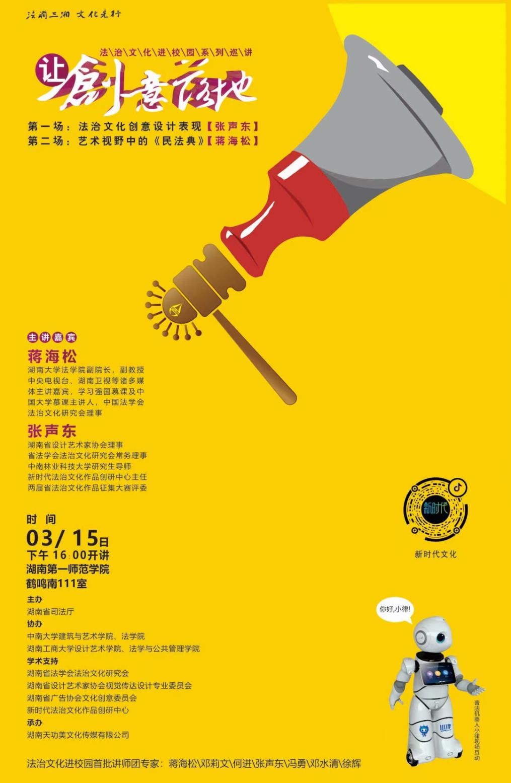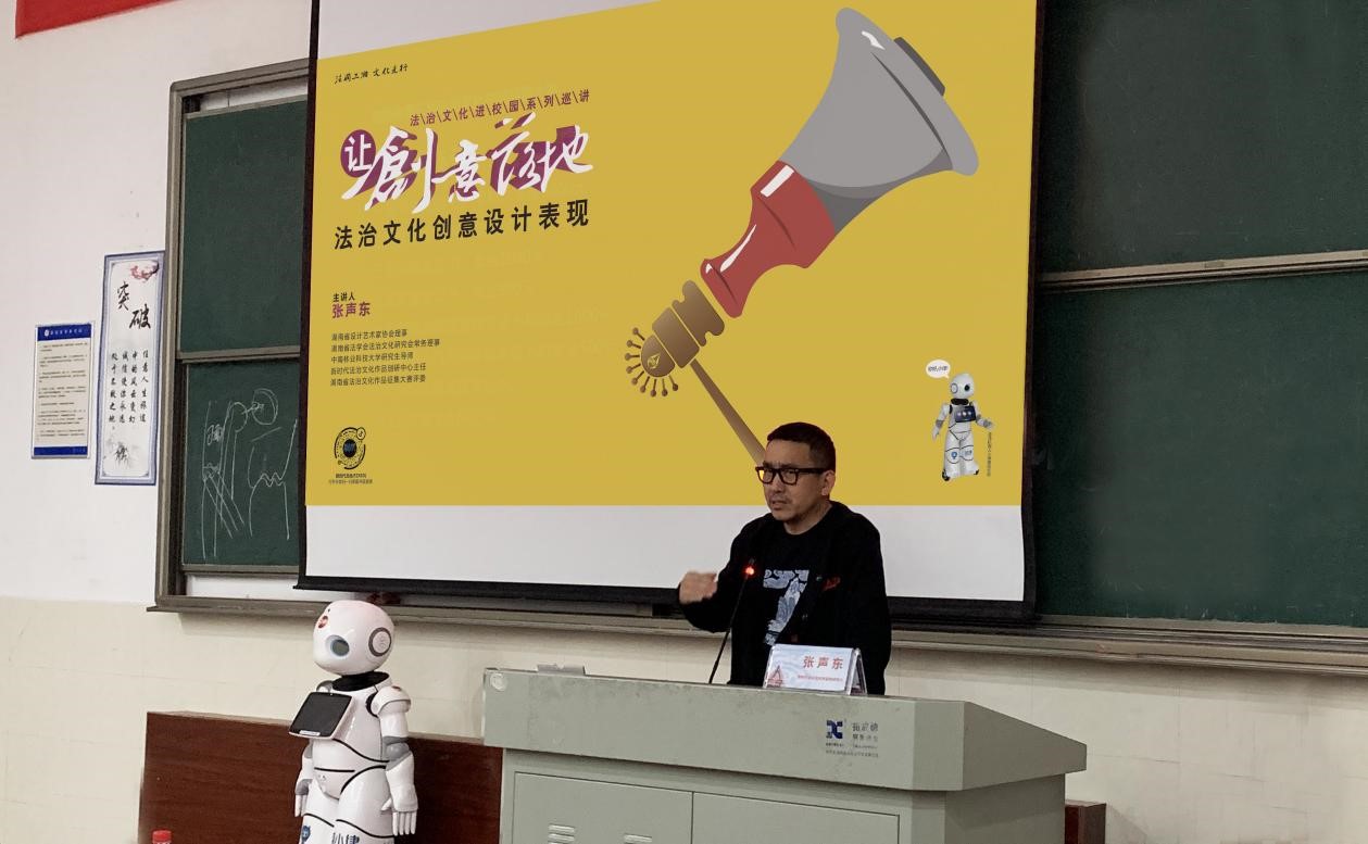 2021年3月15日下午,由湖南省司法厅主办、湖南省设计艺术家协会、新时代法治文化作品创研中心等单位承办的“法治文化进校园”高校巡讲活动第一讲在湖南第一师范公司开讲。首场巡讲邀请了qy球友会副经理、副教授蒋海松及新时代法治文化作品创研中心主任张声东两位老师分别主讲《艺术视野中的民法典》和《法治文化创意设计表现》。此次巡讲首次采用法学专家和设计专家同台讲座的形式,让法律和设计艺术碰撞出美妙火花,呈现法律文化通过艺术表达展现的独特魅力。