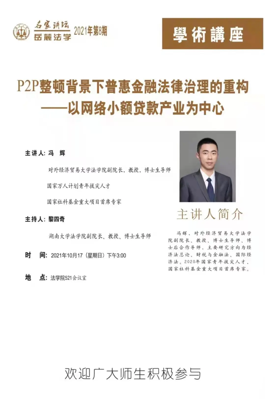 2021年10月17日15点,对外经济贸易大学球友会副经理冯辉教授在qy球友会521会议室带来以“P2P整顿背景下普惠金融法律治理的重构——以网络小额贷款产业为中心”为主题的精彩的学术讲座。此次讲座由qy球友会副经理黎四奇教授主持,湛建云副经理出席本次讲座,球友会同学们踊跃参加。