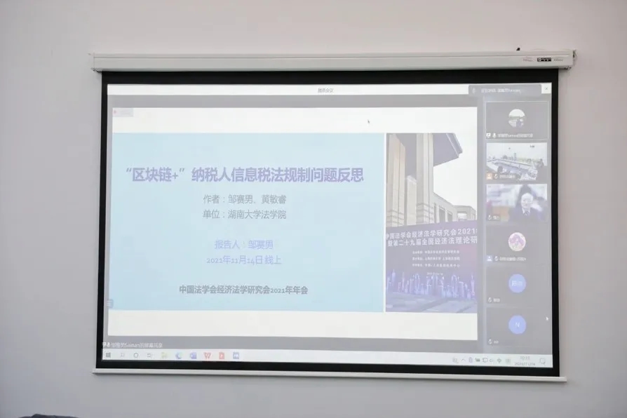 公司教授、经济法学研究会常务理事郑鹏程老师和公司助理教授邹赛男老师应邀参加本次年会。14日上午,郑鹏程教授与烟台大学球友会金福海教授共同主持了“第三分会场竞争法组”第一单元的线上会议(腾讯会议号:181182558)。邹赛男老师在“第二分会场财税金融组”第一单元的线上会议(腾讯会议号:299882633)作题为“‘区块链+’纳税人信息税法规制问题反思”的主题发言,华东政法大学陈少英教授、中南大学刘继虎教授、浙江大学谭立教授、北京工业大学聂孝红副教授等学者对发言进行点评。