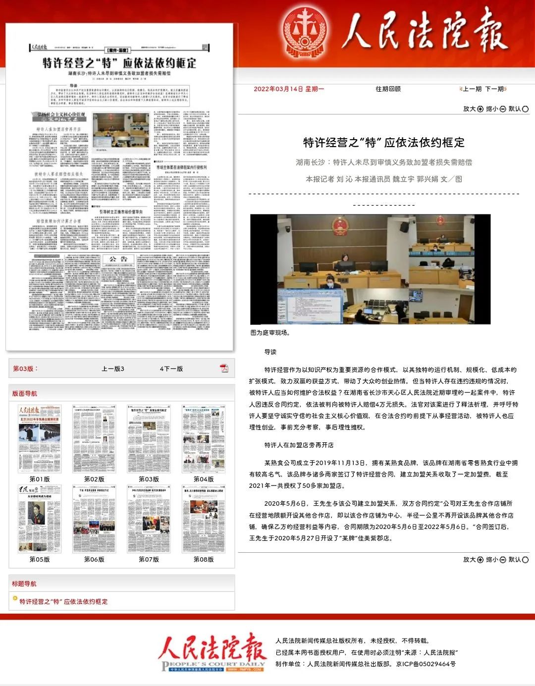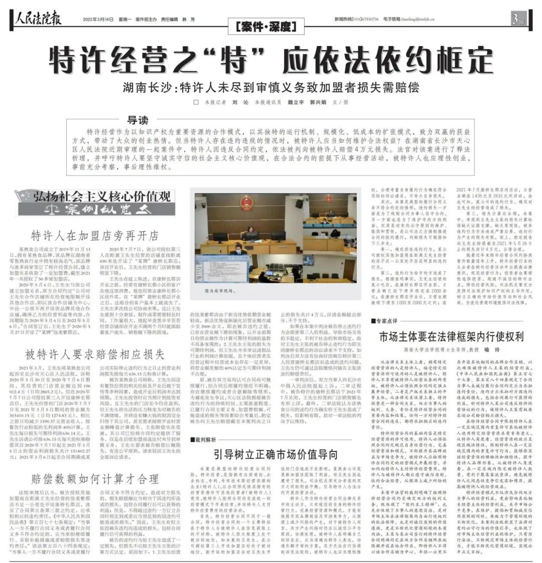 在湖南省长沙市天心区人民法院近期审理的一起案件中,特许人因违反合同约定,依法被判向被特许人赔偿4万元损失。法官对该案进行了释法析理,并呼吁特许人要坚守诚实守信的社会主义核心价值观,在合法合约的前提下从事经营活动,被特许人也应理性创业,事前充分考察,事后理性维权。公司喻玲教授在《人民法院报》上,对本次案件发表专家点评文章《市场主体要在法律框架内行使权利》。