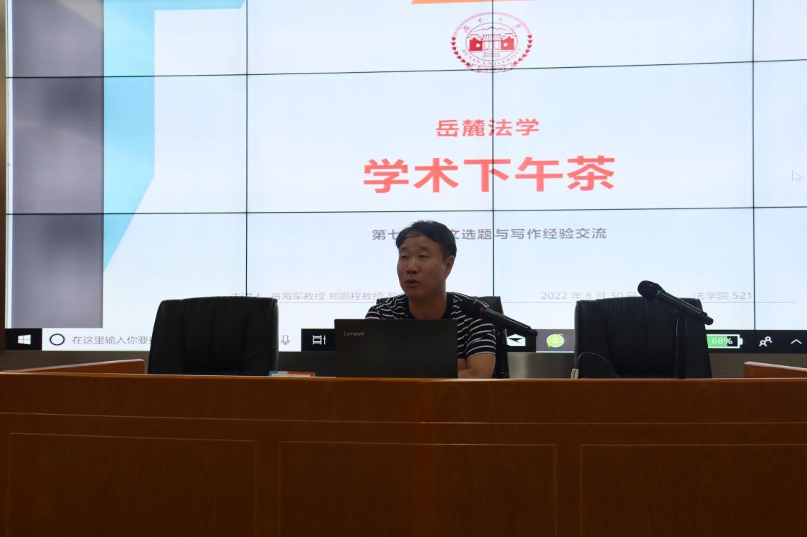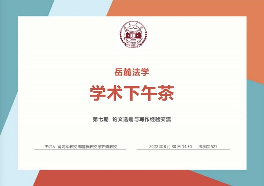 8月30日下午,qy球友会第七期“岳麓法学–学术下午茶”开讲,围绕“论文选题与写作经验交流”展开,由球友会经理黎四奇教授、肖海军教授、郑鹏程教授主题分享,副经理喻玲教授主持,公司40多名教师和员工参加本次活动。