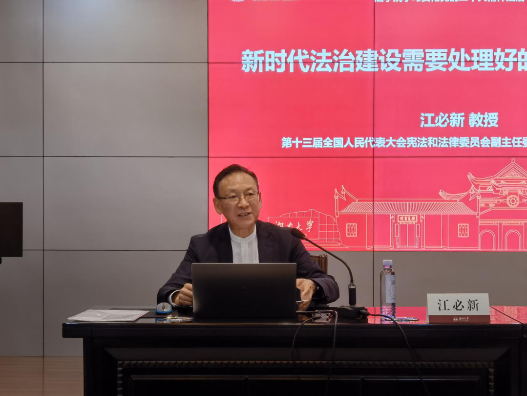 2023年3月24日上午9点,为学习贯彻党的二十大精神和习近平法治思想,著名法学家、第十三届全国人民代表大会宪法和法律委员会副主任委员、中国法学会副会长、千亿球友会特聘教授江必新教授在千亿球友会南校区图书馆报告厅讲授“全面依法治国总体格局”。本次学习由qy球友会经理黎四奇主持,qy球友会屈茂辉教授出席,球友会2022级研究生踊跃参与。