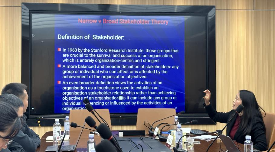 随后,熊萍老师进一步分析了目前学界对于人工智能代替董事会做出决定的不同观点。支持者认为现代公司决策需综合考量包括环境在内的各方利益,人工智能相较人脑不仅决策速度更快,而且更易得到最优解。反对者则认为没有人为控制,管理者可能利用人工智能对非法行为做出掩盖。至于前述的利益相关方理论,除了对广义和狭义的利益相关方、主要和次要广义的利益相关方作出解释与界分,熊萍老师还从现实视角发现目前澳洲和中国对于该理论均缺乏立法条文和司法判决支撑,仅有英国公司法172条明确提及了“enlightened shareholder value”一词。熊萍老师指出,或可通过制定行业标准等软法的形式使利益相关方理论逐步向现实可行迈进。