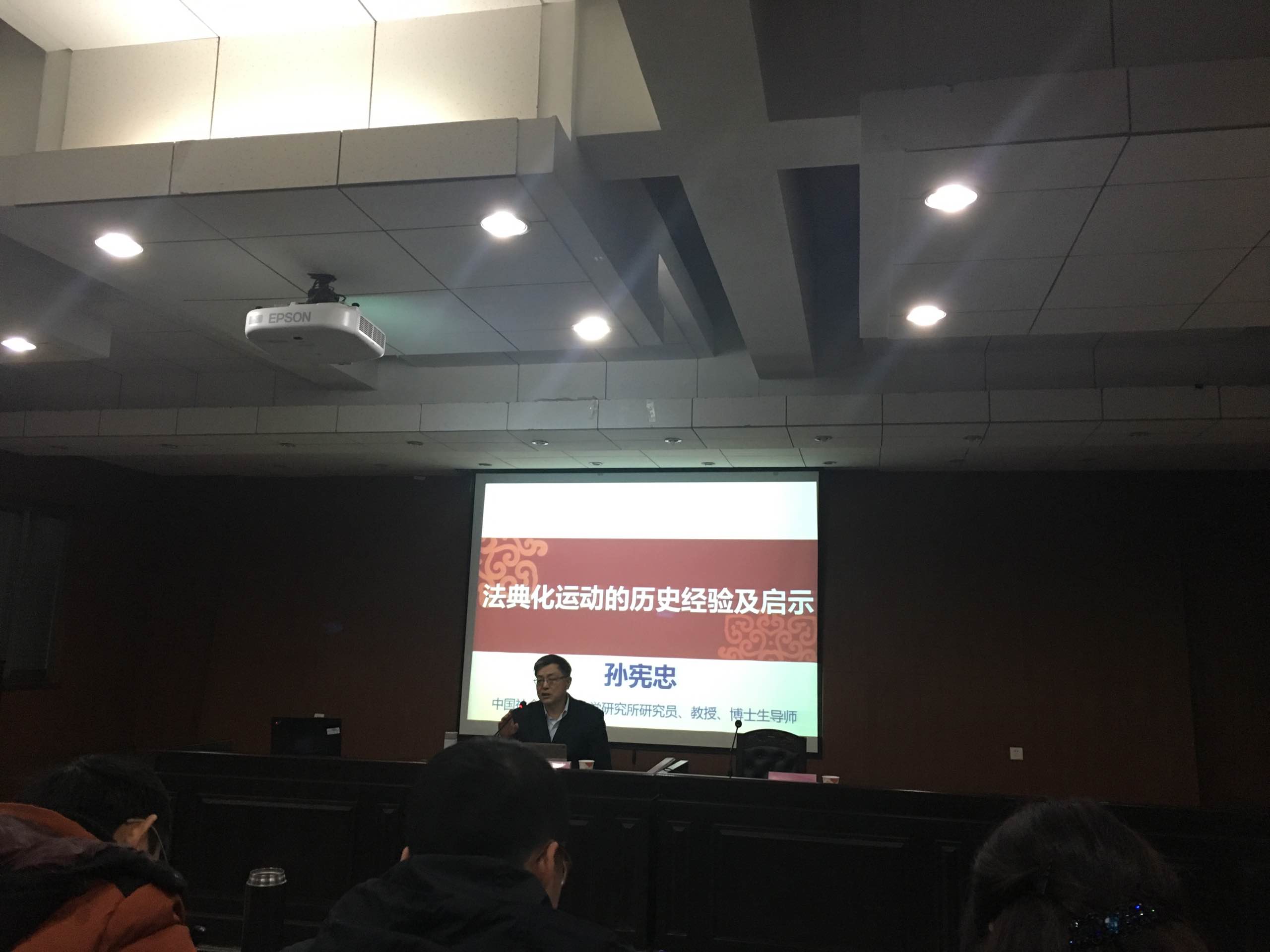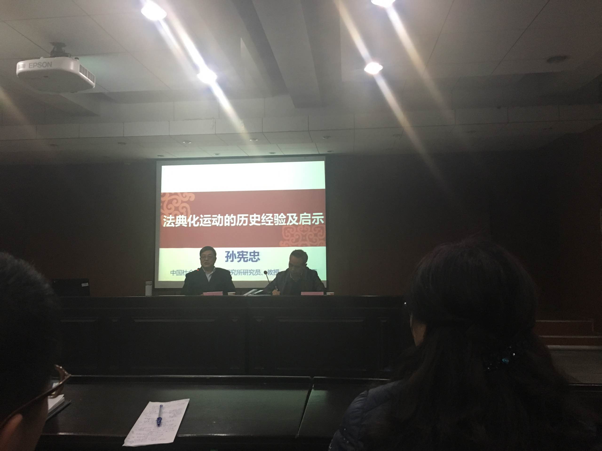 2016年12月18日晚七点模拟法庭,中国社会科公司法学研究所研究员、教授、博士生导师、中国民法学研究会常务副会长、全国人大常委会法工委立法专家顾问孙宪忠教授进行了主题为《法典化历史运动及启示》的学术讲座,经理屈茂辉教授主持讲座。