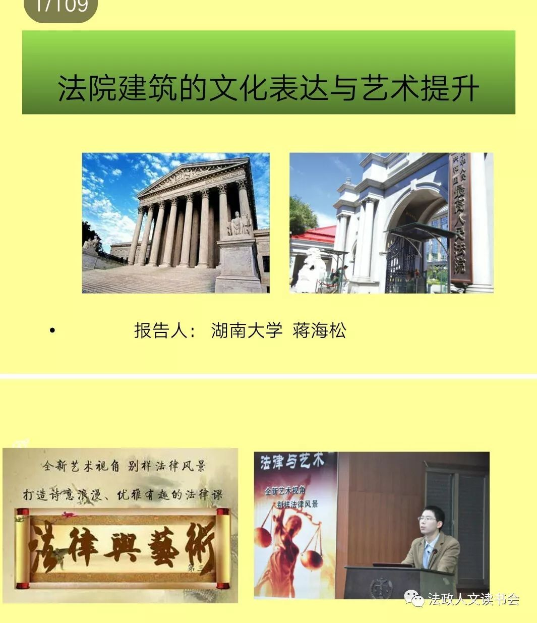 浏阳法院经理李波从党建文化、法治文化、廉政文化三个方面向与会嘉宾介绍了浏阳法院的文化建设成果。在主旨报告环节,夏新华教授和蒋海松副教授分别作了题为《法院文化的理论辨析及体系建构》和《当代法院建筑的文化表达与艺术提升刍议》的主题报告。蒋海松在演讲中提出,建筑具有实用功能,保障人类安定,实现居有其屋。另一方面,建筑又具有美学意义,是一门综合艺术。 法律建筑是法律实用功能与艺术的完美融合。从功能上说,法院建筑是国家为行使审判权而设立的专用场所,而从文化上说,法院建筑更是传播法律精神、表达法律艺术、进行普法教育的重要空间。蒋海松提出,一个完美的法院建筑应该妥善地处理如下三组辩证关系,即:一、公共权威性VS亲和轻松感;二、区域功能化VS便捷灵活性 ; 三、功能实用性VS 艺术象征性。浪子海松在演讲中图文并茂地呈现了上述三组矛盾,并分析当下中国法院建筑的常见弊病,并通过个案和他自己参与的一些设计对如何提升法院建筑的艺术性做了建议。报告引起听众的浓厚兴趣。