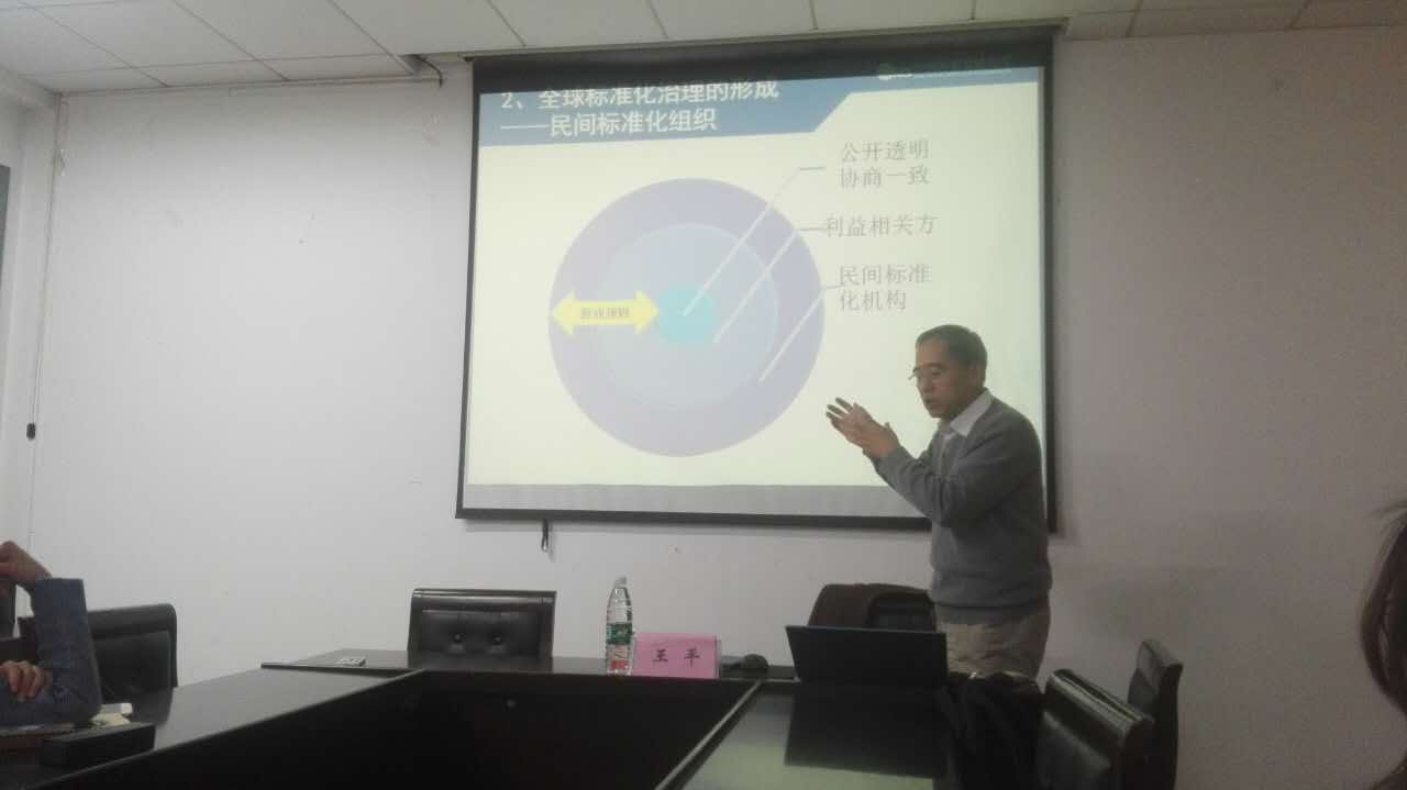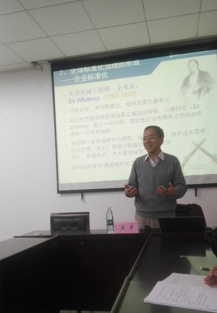 在第一部分基本原理中,王平老师首先介绍了标准的定义,强调标准化是人类在客观世界寻找规则的体现,并引用Nils Brunsson的观点,把一般意义上的显式规则分为准则、指令和标准。标准具有自愿性,个人和机构均可发布标准,标准制定者不具有强制措施,这是最大的区别所在。而在社会学方面,有三种社会制度安排,正式的组织、市场和标准。一个正式组织中的权威中心发布指令,市场中买卖双方的供需关系,标准化也是第三种形式的协调,而它们都建立在议定的程序、标准上。工业技术规则分为三种社会实践:工业标准,涉及安全资源环保的技术法规,企业技术规则。王平老师由此引出现在标准化研究的重点问题:一是工业化发展看标准化的治理方式,二是我国政治体制的优势劣势。第二部分全球标准化治理的形成中,王平老师指出,标准化与工业化发展相伴。并举了几个例子说明了这一点:美国现代化工业之父Eli Whitney,创立了惠氏螺纹的标准连接世界的Sir J.Whitworth,还有大名鼎鼎的福特汽车公司,王老师讲述了它们各自的标准化表现及评价。第三部分标准私有化发展及发展战略中,王老师指出了民间标准化组织的产生和标准的自愿性,标准化组织的发展情况和特征。并比较了欧、美、日韩加标准化机构的性质。接下来王老师用几个模型讲解了标准化组织的公私频谱,以此对“一流企业都卖标准”的说法予以批驳:“只有ICT产业的标准才有战略地位,一流企业卖标准只是个别案例”。在最后一部分中,王老师对我国自主创新标准化战略进行了肯定,同时提出了自己的建议:标准化改革需要产业协会联盟等与企业合作,提高民间标准化组织的积极性,减少政府的过多干预。