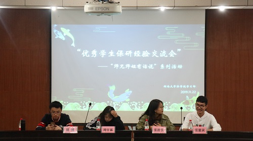 2019年11月22日晚,由球友会员工会学习部主办的“师兄师姐有话说”系列活动之优秀员工保研经验交流会在球友会模拟法庭顺利举办。傅博、周官霖、张舒昱、张慈寅四位成功保送至中国政法大学、武汉大学、南京大学的16级优秀员工和17、18、19级的同学们分享自己的保研经验。