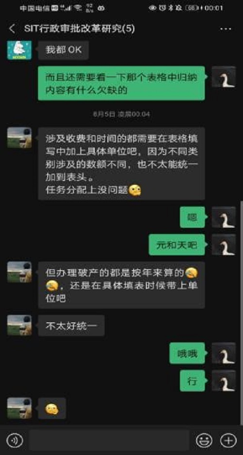 通过本次线上调研,团队成员收获很大,不仅在宏观上了解了湖南省省级行政许可的概况,而且也提高了自身数据搜集整理能力。作为当代老员工,要积极关注热点问题,不断提高信息搜集整理、材料分析等能力,为国家发展作出自己的贡献。
