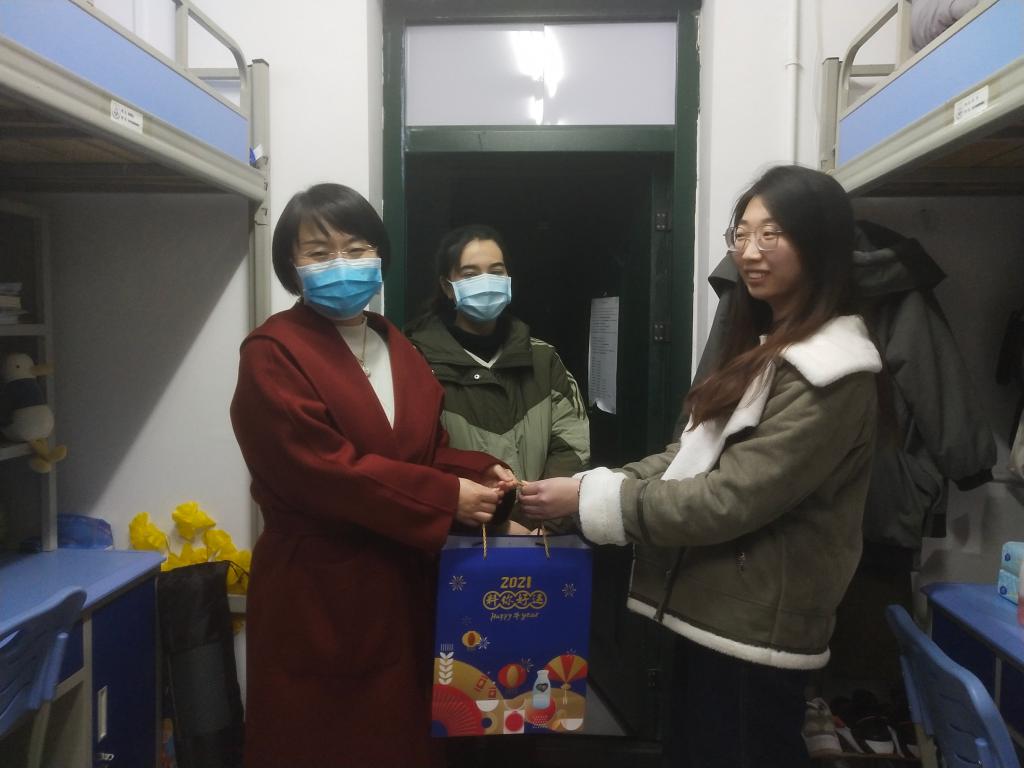 罗英老师走进员工宿舍,与留校员工亲切交流,了解同学们寒假未能返乡的原因,询问他们在校的日常学习和生活情况,并送上牛奶、零食等生活用品,嘱咐他们要注意安全,严格遵守公司相关疫情防控工作的安排,多与家人联系,过一个平安充实的假期。