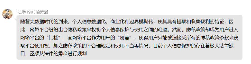 结合文本与案例以及小组成员的生活实践,我们发现,网络平台隐私政策以下代表性的问题:平台隐私政策冗长,术语多,使用者“同意”质量低;平台信息处理过程不透明;“知情-同意”原则难以完全保护隐私;使用者的信息“被遗忘权”等权利难以实现,维权过程复杂;《民法典》隐私权尚未落地,隐私暂借其他权利之名来维护。