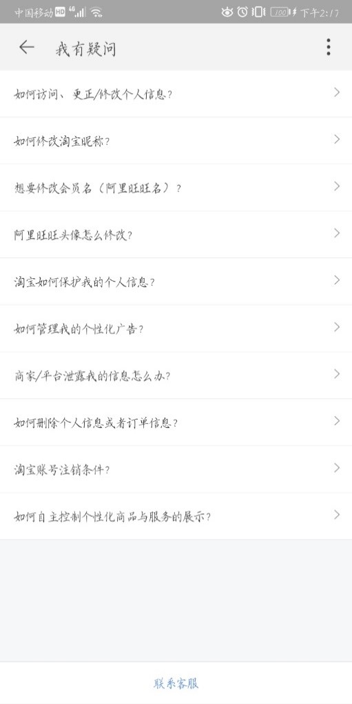 图表2 淘宝隐私政策下设的“我有疑问”栏目