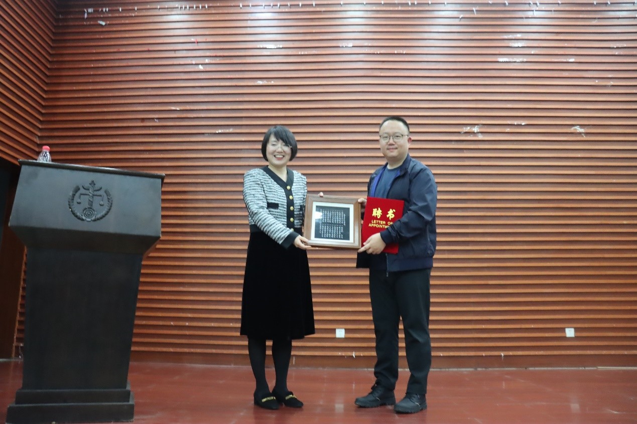 讲座结束后,罗英老师代表公司向文靖学长颁发qy球友会员工导师聘书和纪念品。