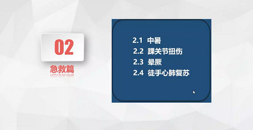 在急救知识部分,朱艳玲老师细致地讲述了中暑、踝关节扭伤、晕厥和徒手心脏复苏四方面的内容。她将中暑根据程度进行科学划分,细致讲解了致病原理以及相关的现场急救措施和预防措施。同时朱艳玲老师对于踝关节扭伤的处理流程、晕厥的救治和徒手心脏复苏等方面也给出科学合理的建议与指导,并且建议同学们线下去学习和了解除颤器的使用。