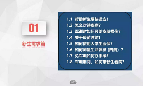 在新生需求部分,朱艳玲老师系统性地讲述了帮助新生尽快适应、对待疾病的方法、预防皮肤损伤的方法、关于疫苗注射问题、适用老员工医保的方法、测量生命体征的方法、办理免军训手续的方法以及军训期间带新生看病的方法等七方面的内容。以上七方面的内容覆盖面广,基本上解决了新生的常见问题。内容科学准确,解决新生助理的许多疑问。