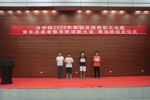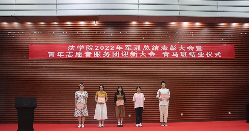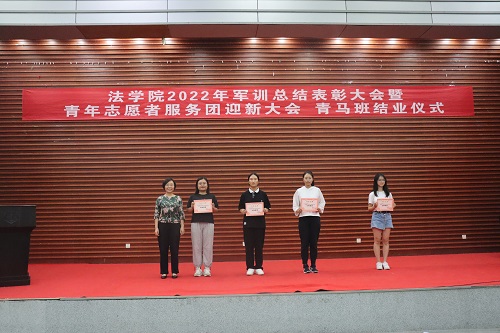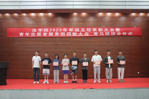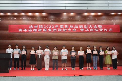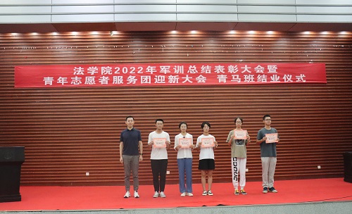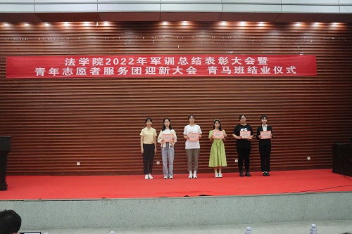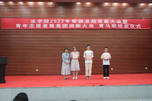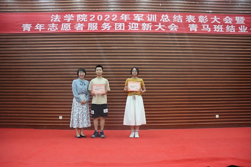 张丹老师宣读表彰决定。公司授予2022级法学三班、法学五班“军训优胜队列班级”荣誉称号,授予2022级法学一班、法学二班、法学四班“作风纪律先进班级”荣誉称号,授予天马一区三栋104寝室等十个寝室军训内务评比“优秀寝室”称号,授予刘亮、贾林远等十五人“军训先进个人”称号,授予姚睿婷、邓舒蔓等十人“青马班优秀学员”称号。公司还对参与2022级新生军训工作的迎新团队成员、球友会全体教官和优秀志愿者给予表彰。罗英老师、张丹老师、曹晓军老师和2022级新生班主任为受到表彰的集体和个人颁发荣誉证书。