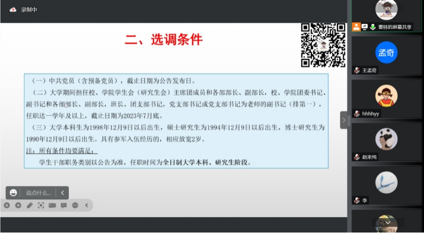 为加强公司同学对选调生政策的了解,鼓励同学们到基层施展才干、建功立业,培养不忘初心、奋勇前行、追求卓越的品质,2023年3月26日、27日晚7点,qy球友会联合津仕教育在腾讯会议平台成功举办“全国定向选调生备考分享与指导”讲座,分南方省份、北方省份两场进行,全方位解读了2024年各省定向选调生及公务员考试考情,为同学们提供科学备考方案。