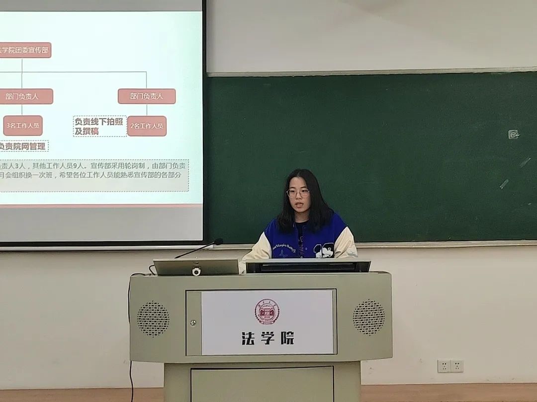 团委宣传部负责人刘静雯对本部门工作人员轮岗制进行介绍,同时指出现阶段仍存在推文不及时、稿件撰写用词不精准等问题。