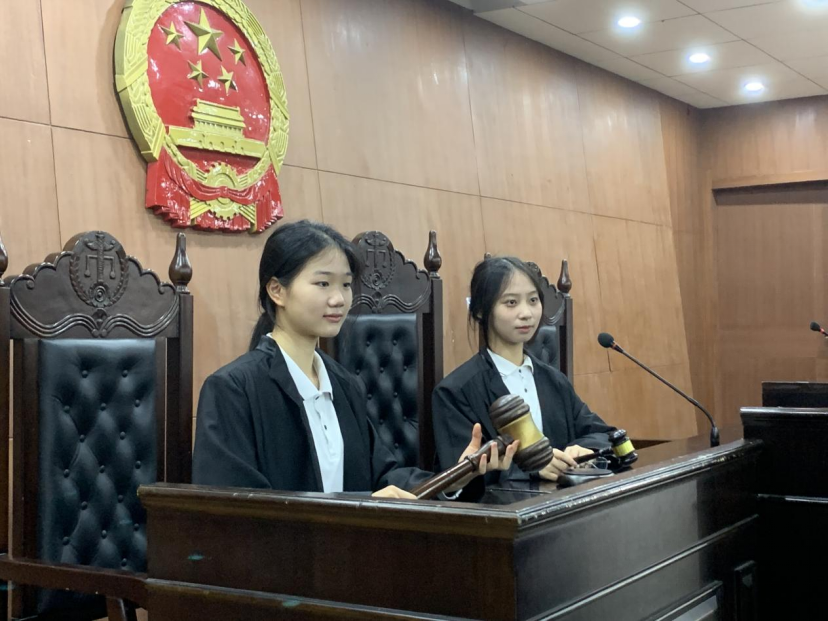 随后,蒋海松老师带领同学们参观模拟法庭,同学们分别身着法袍、高举法槌“入庭履职”,兴致盎然。