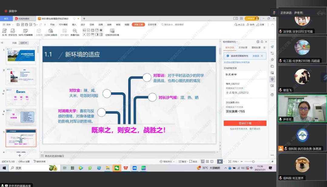 本次讲座分为三个部分:新生需求篇、急救篇以及传染病篇。在新生需求部分,尹老师着重强调了对新环境的适应,要做到既来之,则安之,战胜之。此外,尹老师还对疫苗注射、员工医保的使用以及军训免训手续的办理做了详细讲解。